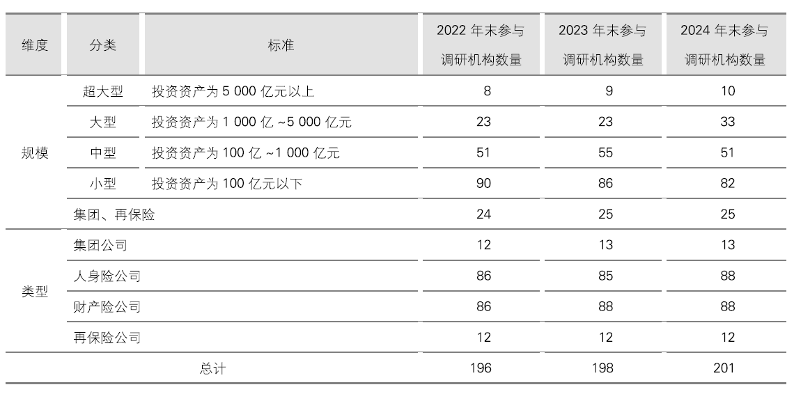 2024年,共有201家保险集团(控股)公司和保险公司(以下统称保险公司)参与调研,投资资产合计30.55万亿元,占全行业资金运用余额的91.85%。为全面剖析展示保险公司资金运用情况,根据资金运用规模、机构类型,对201家保险公司进行了分类。