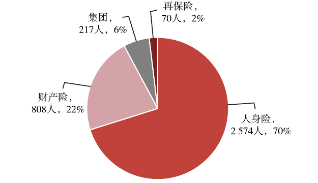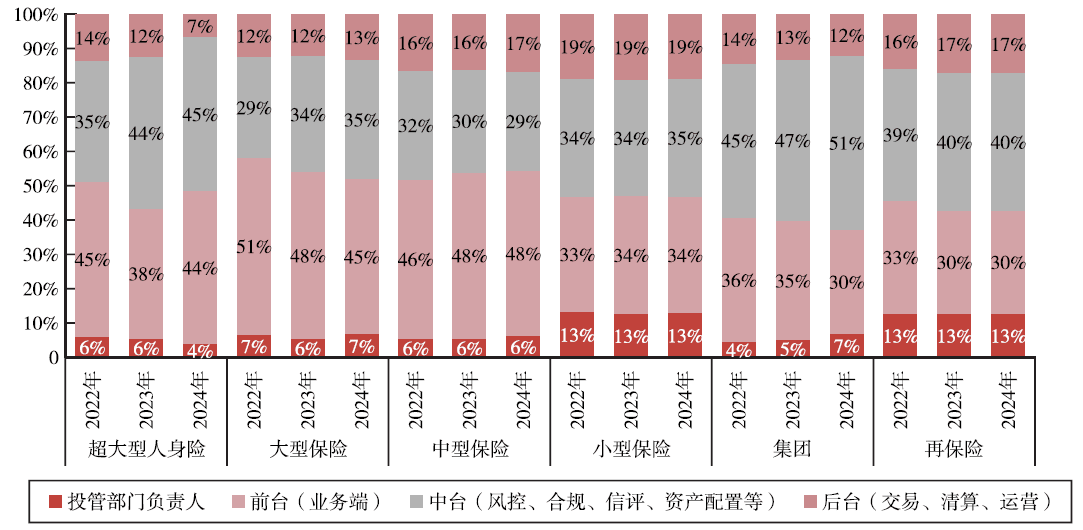 前中后台配置方面,超大型人身险公司、保险集团在中台人员比例更高。超大型人身险公司前台人员占比上升6个百分点,后台人员占比下降5个百分点;大型保险公司前台人员占比下降3个百分点;中小型保险公司人员分布基本不变;保险集团前台人员占比下降5个百分点,中台人员占比上升4个百分点;再保险公司与上年保持一致。