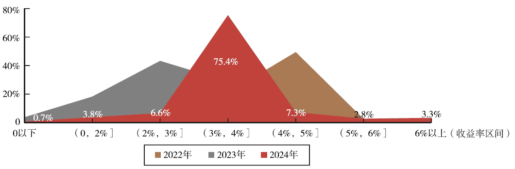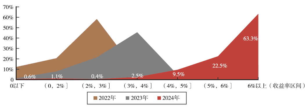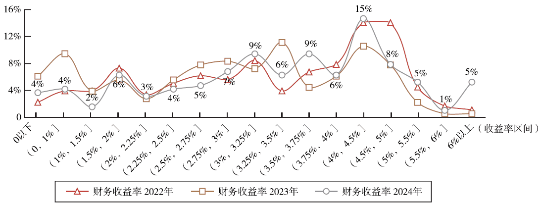 2024年,保险公司综合收益率集中区间较2023年显著上升,财务投资收益率集中区间也高于2023年,且综合收益率集中区间整体高于财务收益率集中区间。