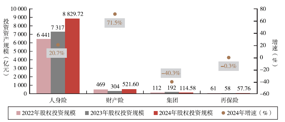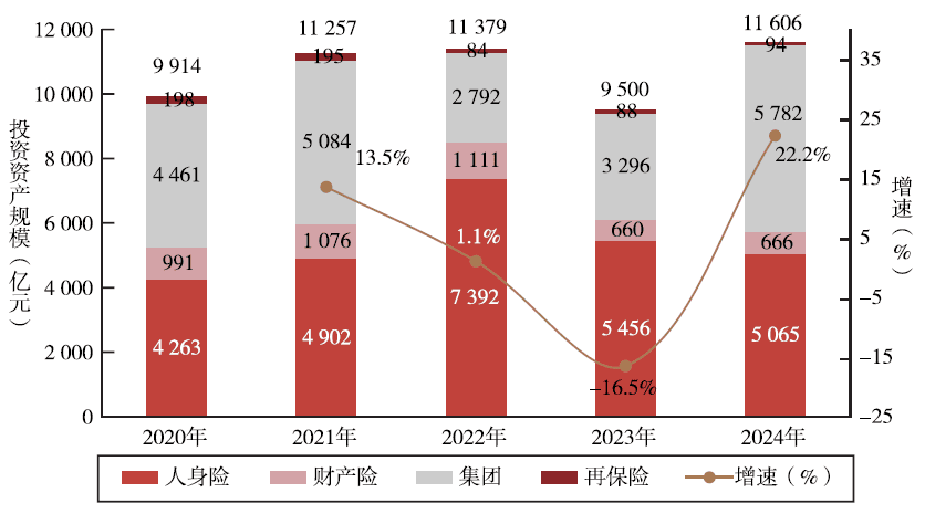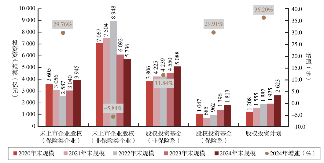 图12 2020-2024年保险公司股权投资各类资产规模及增速