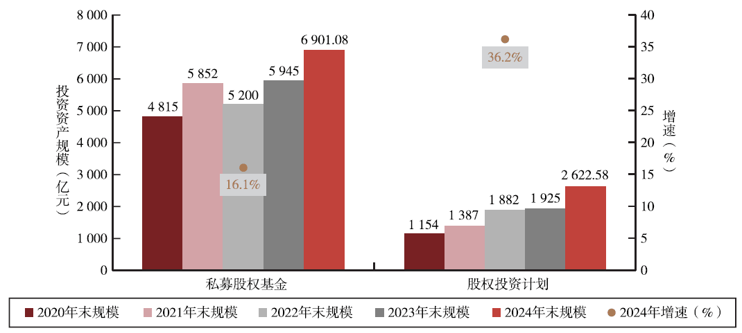 整体来看,截至2024年末,参与调研的保险公司股权投资资产规模为1.92万亿元,占总投资资产的6.35%,规模同比增长12.95%。股权投资资产配置比重位居利率债、信用债、股票、银行存款之后,为第五大资产配置类别。