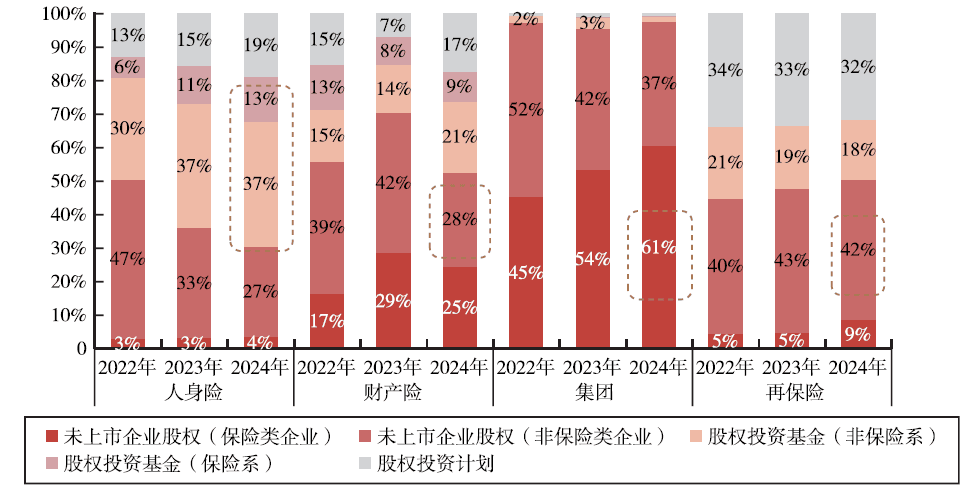 图15 2022-2024年各类型保险公司直接股权投资占比情况
