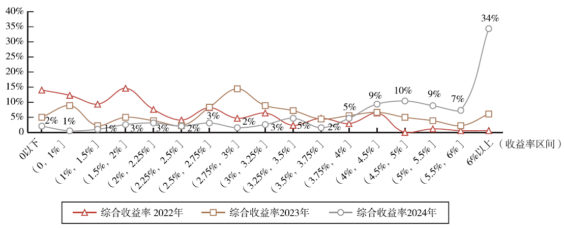 综合收益率方面,2024年行业综合收益率分布整体集中于4.5%以上,机构数量合计占比超过60%,远高于2023年(17%)和2022年(3%),其中综合收益率中位数位于5%~5.5%;位于6%以上的机构数量最多,占比34%。财务收益率方面,财务收益率在4%以上的机构数量合计占比34%,高于2023年(22%)。