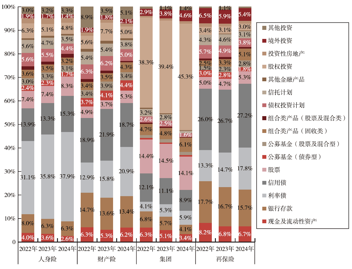 不同类型的保险公司资产配置结构存在较大差异。人身险公司资产配置结构与行业总体结构趋同;财产险公司主要配置债券和银行存款;保险集团股权类资产配置占比较高;再保险公司主要配置债券和银行存款。