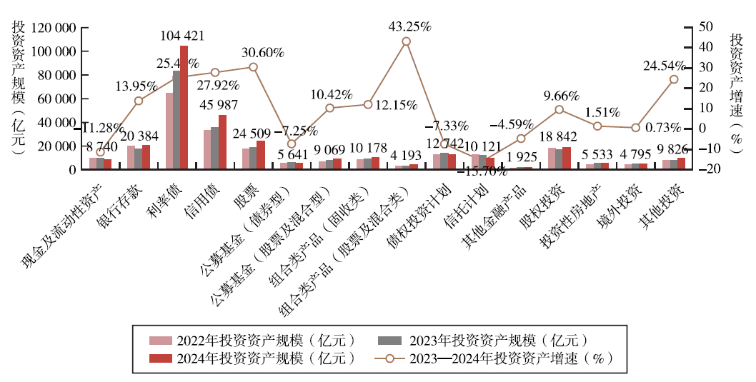 从资产规模增长情况来看,截至2024年末,现金及流动性资产、公募基金(债券型)、债权投资计划、信托计划、其它金融产品规模下降,其余各类主要资产的投资规模均有不同程度的增长。其中,投资规模增速前三为利率债(104421亿元)、信用债(45987亿元)、股票(24509亿元);投资规模增速前三为组合类产品(股票及混合类)(43.25%)、股票(30.60%)、信用债(27.92%)。